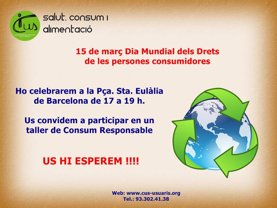 La CUS per celebrar aquest dia organitza un taller de Consum Responsable a la Plaça de Sta. Eulàlia de Barcelona, a Vilapiscina. També ens trobareu a Lledia Ciutat al Centre cívil Les Pardinyes, a l'exterior, on us facilitarem tota mena d'informació, i a l'Hotel d'Entitats de Tàrraga.