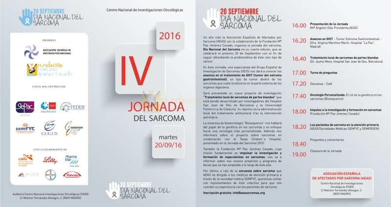 Aquest any el Dia Nacional del Sarcoma en la seva quarta edició, es celebrarà amb la finalitat de seguir difonent la problemàtica d'aquest rar tipus de càncer.