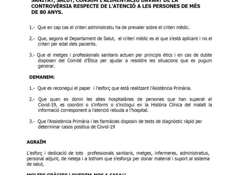 abril 1, 2020 | Alimentació Comunicat de Premsa davant de la controvèrsia respecte de l’atenció a les persones més grans de 80 anys en la crisi de la Covid-19