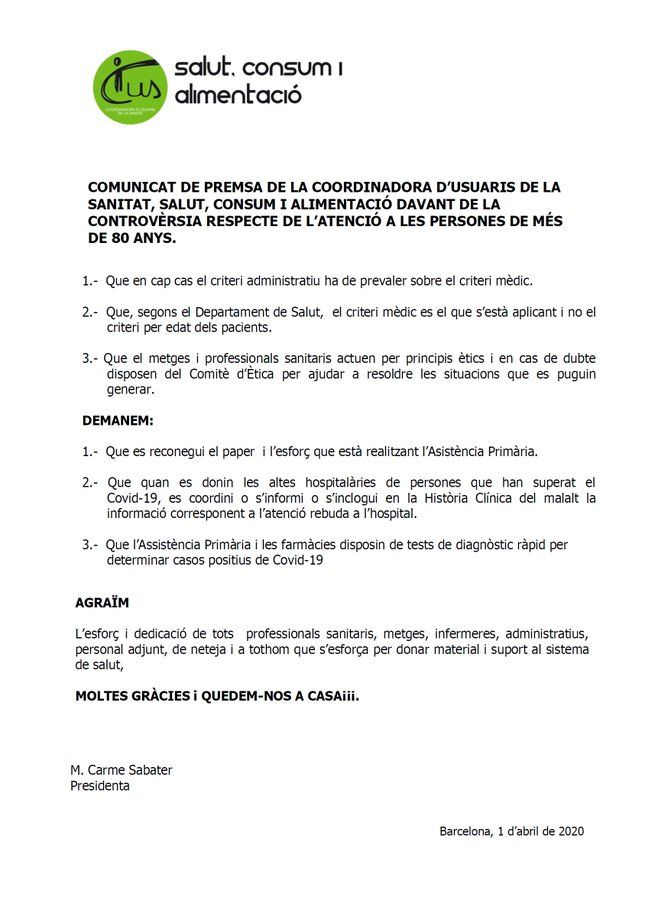 Comunicat de Premsa de la CUS – Coordinadora d’Usuaris de la Sanitat. Salut, Consum i Alimentació davant de la controvèrsia respecte de l’atenció a les persones més grans de 80 anys en la crisi de la Covid-19