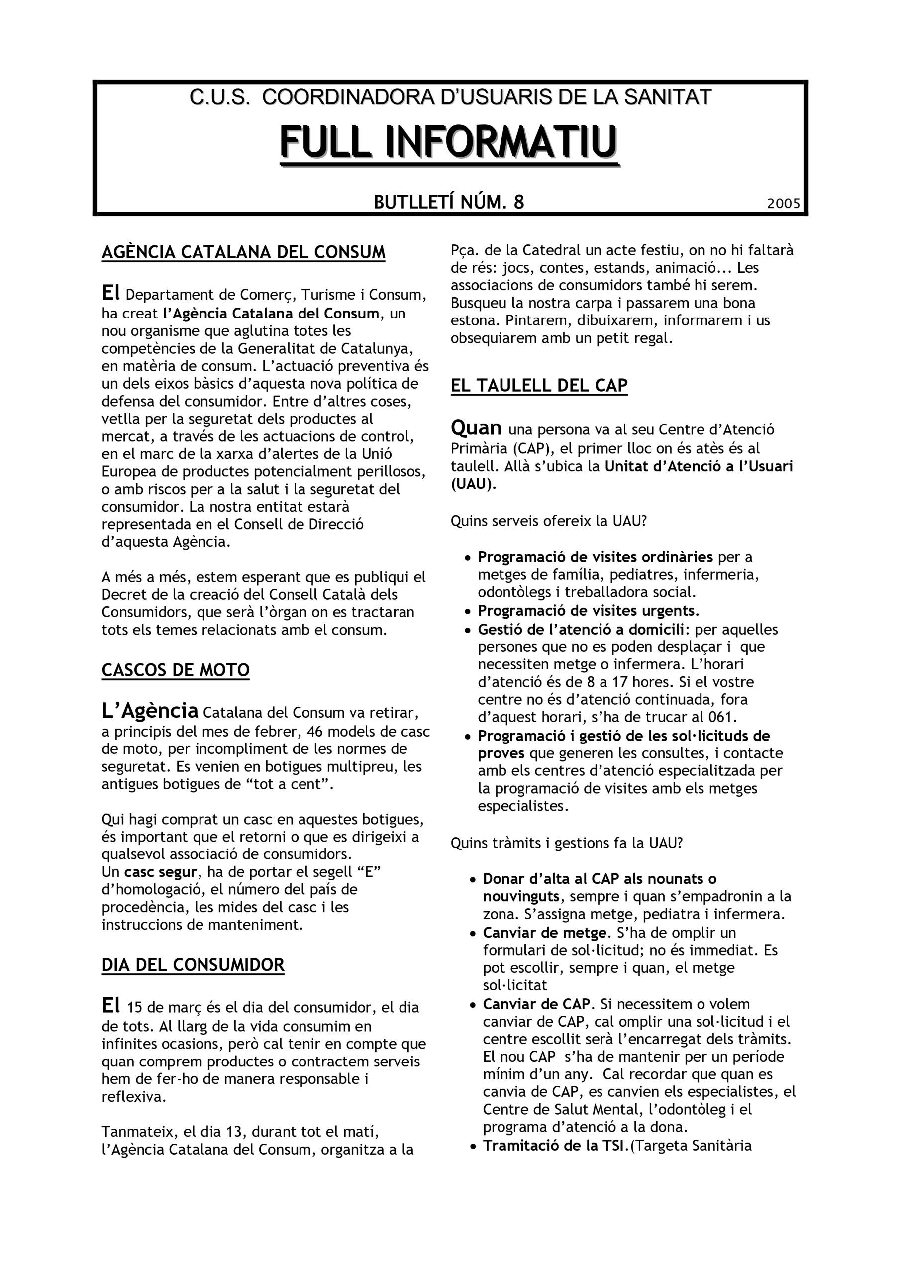 El Full Informatiu nº 8 (2005) presenta informació d’interès sobre salut, consum i serveis públics, destacant novetats institucionals i consells pràctics per als usuaris. El número s’obre amb la creació de l’Agència Catalana del Consum, organisme que centralitza totes les competències de la Generalitat en matèria de consum, amb l’objectiu de garantir la seguretat dels productes al mercat i fomentar la prevenció de riscos per a la salut. La CUS anuncia que formarà part del Consell de Direcció d’aquesta nova entitat i espera la constitució del Consell Català dels Consumidors, que actuarà com a espai de participació i assessorament en temes de consum.