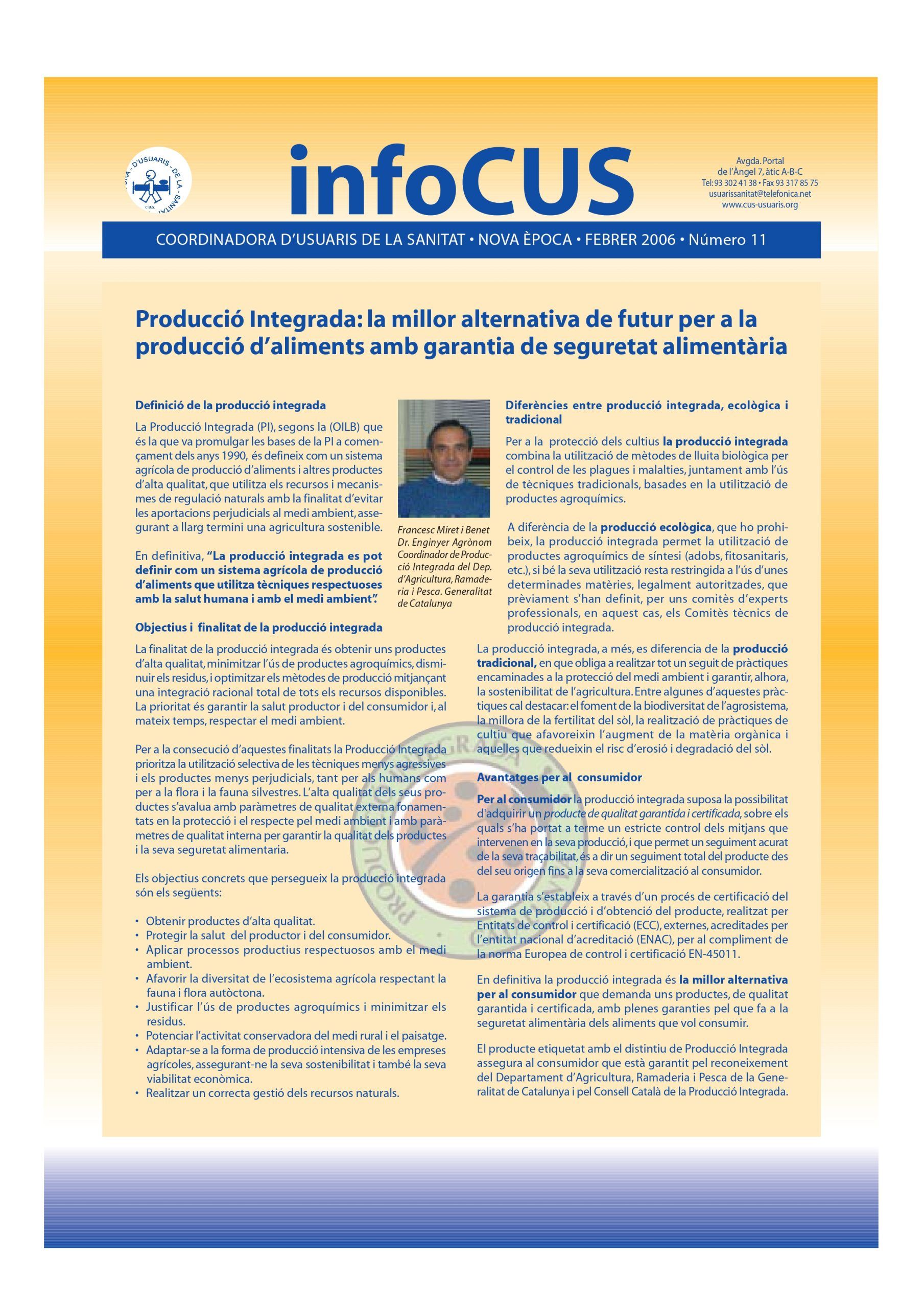 La revista INFOCUS nº 11 (2006) dedica el seu contingut principal a la producció integrada com a alternativa sostenible i segura dins del sector agroalimentari. L’article principal, signat per Francesc Miret i Benet, del Departament d’Agricultura de la Generalitat, explica que la producció integrada (PI) combina tècniques tradicionals i biològiques per reduir l’ús de productes químics i garantir aliments de qualitat amb respecte pel medi ambient. Detalla els seus objectius —com minimitzar residus, protegir la salut del consumidor i preservar la biodiversitat— i la seva diferència amb la producció ecològica (que no permet productes químics) i la tradicional (que no imposa controls ambientals). També explica que els productes de PI són certificats per entitats acreditades (ENAC) i identificats amb un segell oficial, assegurant la seva traçabilitat “de la granja a la taula”.