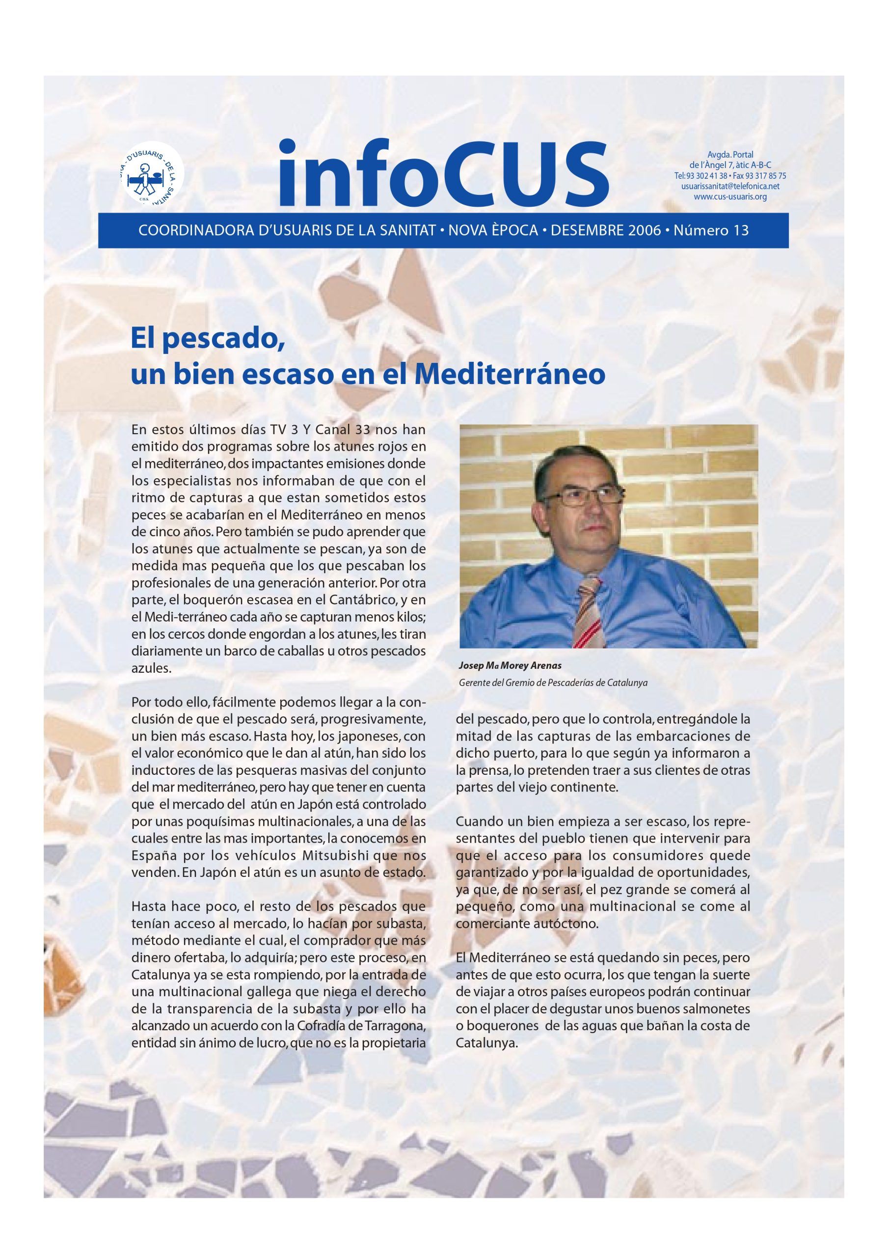 La revista INFOCUS nº 13 (2006) tracta temes de salut, seguretat alimentària i consum, amb una clara orientació educativa i divulgativa. El número s’obre amb un article titulat “El pescado, un bien escaso en el Mediterráneo”, on Josep M. Morey, del Gremi de Peixateries de Catalunya, alerta sobre la sobreexplotació de l’atún vermell i altres espècies com el seitó i la caballa, i denuncia l’acaparament del mercat per part de grans multinacionals, especialment japoneses i gallegues. L’article fa una crida a la intervenció pública per garantir la sostenibilitat i l’accés equitatiu al producte.