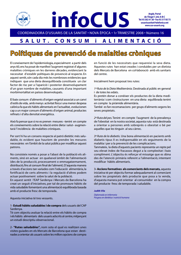 La revista INFOCUS nº 16 (2008) tracta temes de salut, seguretat alimentària i consum responsable, amb articles centrats en la prevenció de malalties, la traçabilitat dels productes i la protecció dels drets dels consumidors. El número s’obre amb un reportatge sobre les polítiques de prevenció de malalties cròniques, que adverteix de l’augment de patologies derivades de dietes desequilibrades i hàbits sedentaris. S’hi destaca la importància d’una alimentació basada en productes frescos, locals i de temporada, i es presenta la iniciativa “Rutes saludables” dels Mercats de Barcelona, que promou hàbits alimentaris saludables i educació nutricional per a la població i per als comerciants.