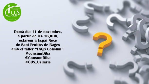 Demà, dia 11 de novembre, a partir de les 18:00h, estarem a Espai Nexe de Sant Fruitós de Bages amb el taller “FAQS Consum”.